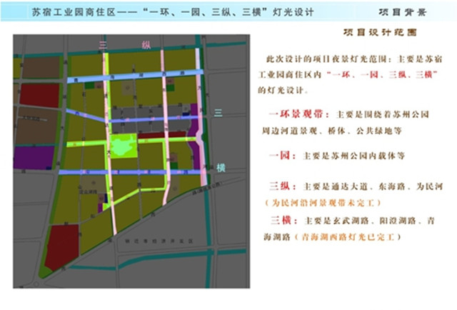 本次商住區(qū)亮化提升工程圍繞“一環(huán)、一園、三縱、三橫”進(jìn)行重點(diǎn)打造,燈光設(shè)計(jì)以“綠色的、生態(tài)的”為定位,不但要展示宿遷的城市特質(zhì),提升市民的自豪感和安全感,鼓勵(lì)周邊市民夜間步行,還將以現(xiàn)代科技之光區(qū)展現(xiàn)蘇宿園區(qū)騰飛的城市變遷。