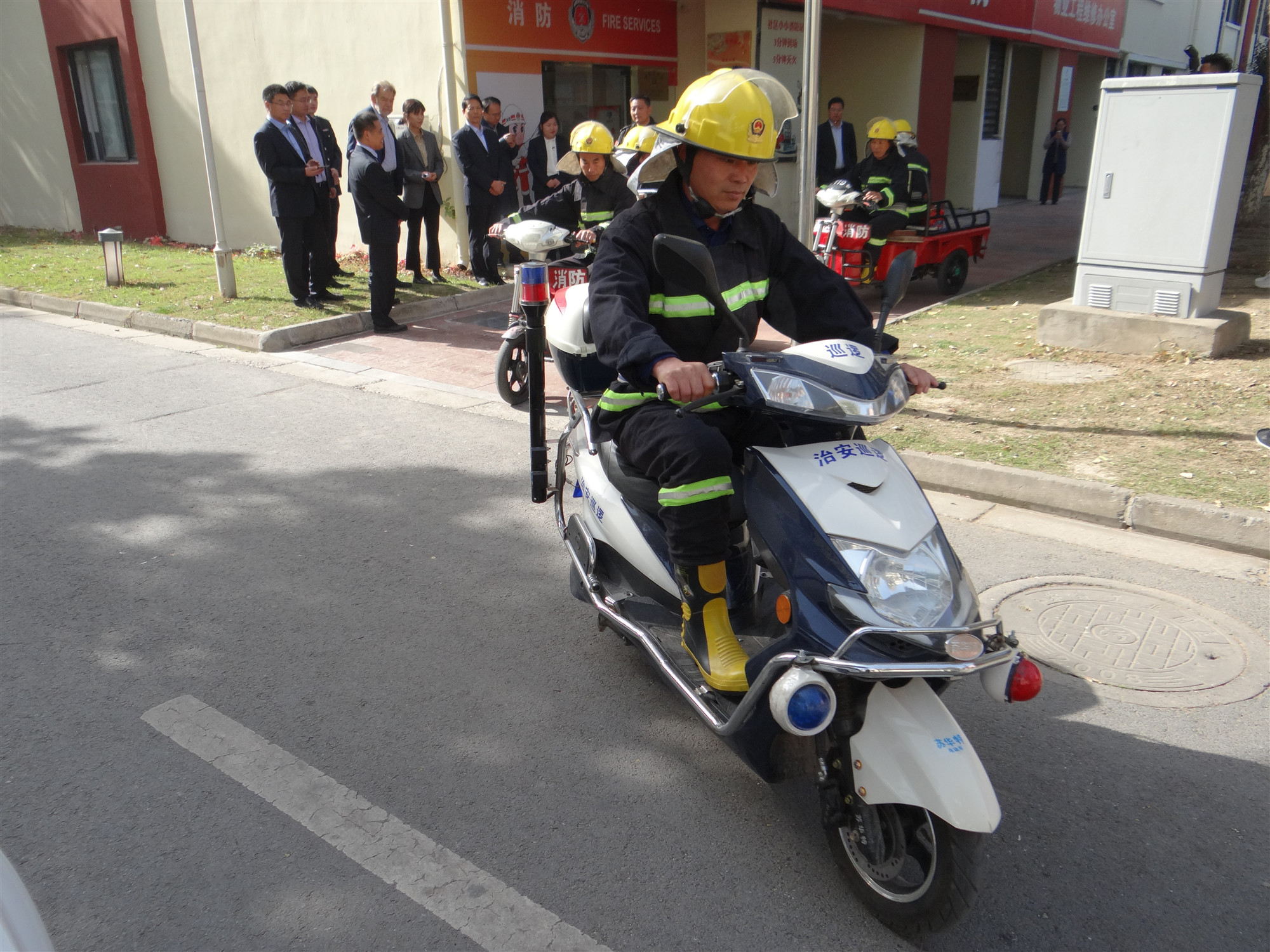 公舍管理人員詳細介紹了安全管理工作開展情況,包括日常巡查、安全知識宣傳及臺賬管理;隨后管理人員帶領(lǐng)檢查組實地查看微型消防站運行情況,重點介紹火災預防和初期火災處理,原則上3分鐘到場,5分鐘滅火,最后組織義務(wù)消防員進行實地拉動演練。